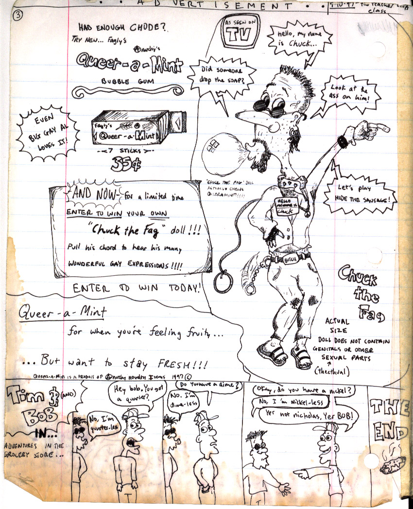 description: this is another product page. It's an ad for "Queer-a-mint Bubblegum" (a pun of "spearmint"... bad, I know) that says you can enter to win a "Chuck the Fag" talking doll. I guess the humor in it is that I'm trying to show a world where homosexuality is so accepted and loved that people would buy gum in order to win a doll who displays the gayest of all qualities. Note Chuck's wardrobe/accessories: small goatee, one earring (which should be on the right, come to think of it...), a studded wristband, thin wire-frame glasses (hey I used to wear those...), a handkerchief around his neck with printed hearts, a gaudy gold chain necklace with a peace sign on it, sandals, a belt buckle that says "butch", handcuffs hanging out of his back pocket, and dirt-stained knees (ooh! didn't want to notice that one, did you?). This guy became my most popular character. well, not the doll... the cartoon who the doll was based on.