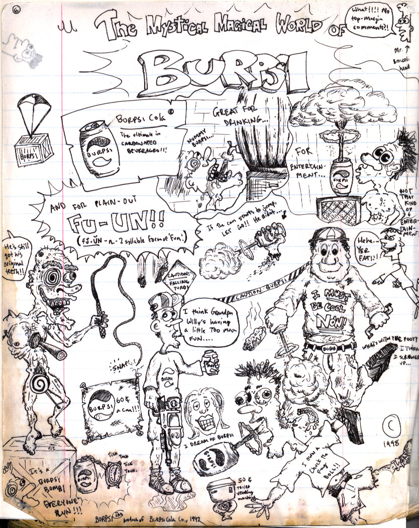 description: ah... The Magical World of Burpsi. This is another product page and it was very well recepted. Right about this time, I was gaining a small fan base of people in my classes who would ask every day if I'd drawn anything new. I'd always make sure not to show anyone anything until the page was completed entirely. But about the product, it's "Burpsi", the world's most carbonated beverage. Just open it, and you can watch the miniature fountain of soda. Oh wait... does that sound familiar? Yep. A long while after I made this, Sprite had an advertisement featuring a fake soda called "Jookie". They used special effects to create the fountain of soda. A little while after this commercial came out, people were saying to me, "Sprite stole your idea!" But this wasn't until a while after I stopped drawing so I didn't care. The name "Burpsi" is borrowed from a halloween edition of Cracked Magazine. Just the name was taken, though. It didn't have any fountain spraying. Oh, and this is the third and final company in my little world of fake advertising - remember them all? "Chode Industries", "Anarchy Novelty Items", and "Burpsi Cola Co."
