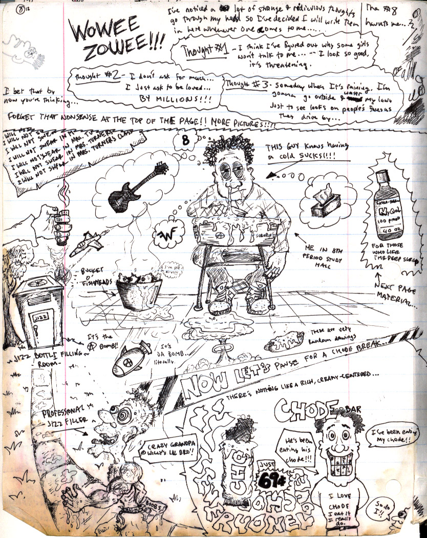 description: it looks like I started this page by just writing a bunch of stuff and eventually remembered that people don't like to look at words, they like to look at pictures. Keep in mind, when I made this notebook, there were many people waiting to see it when I got a page done. I had to do a lot of pleasing. Anyway, some of those quotes up there can be seen in the "quote this!" section of this page. Now you know where I got them. It's in that black bar to the left of this frame and you should look at it when you're good and ready. The rest of the page is illustrated and pretty much describes how I was feeling when I made this page. That guy in the desk is supposed to be me in study hall, although my nose isn't that big. It sucks having a runny nose and being tired in study hall, cuz if you go to sleep you have to put your head down and your nose will drip... as illustrated. Below this picture is an ad from Chode Industries for their 2 products. There's a "Jizz Bottle Filling Room" on the left, and a happy chode eater on the bottom right.