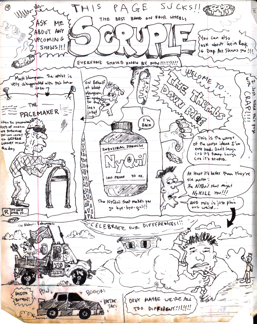 description: on the top margin of this page, I put a rather snobby ad for my band cuz I figured all this notebook publicity should help my band. Everything else on this page pretty much stinks. There are 2 horrible ads - one's just a bad pun of a popular movie at the time, and the NyQuil ad is just... bad. As you can see by my comments, I knew it was bad as I was making it. On the bottom I pretty much gave up on the page and just drew weird ass shit. There's a big fat fellow with someone riding him like a horse, another guy cracking a whip on his shoulder, and another guy being eaten by the enormous man. Oh yeah, and there's a log cabin and a chili cheese dog on his back.