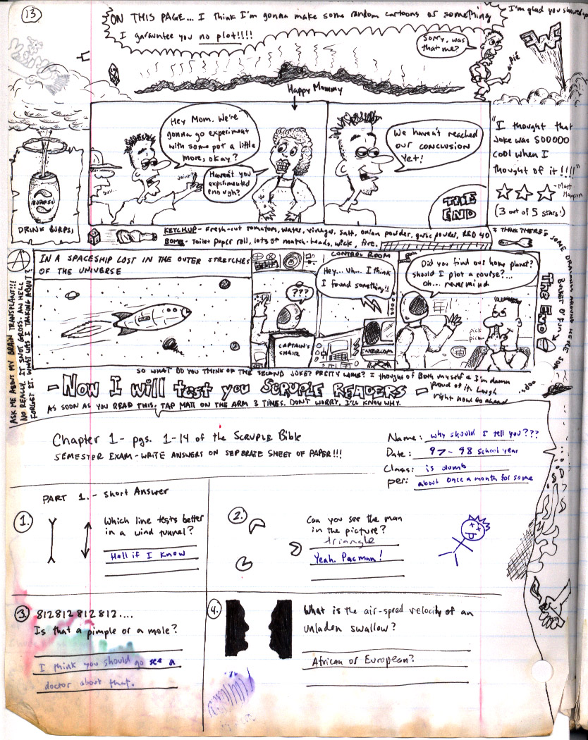 description: on this page, I abandon the plot and revert back to my normal nature - stupid jokes and a whole lot of tiny sentences that people love to read. Especially that one below the second comic: "AS SOON AS YOUR READ THIS, TAP MATT ON THE ARM 3 TIMES. DON'T WORRY. HE'LL KNOW WHY." Most of the time I didn't. I would be like, "What?" then shortly after, "oh." That sentence was just inviting opportunities for me to look stupid. People liked the comics, though. Especially the drug one. (Surprise? These were high school kids judging my comic.) The lower half of the comic was a fake test I made for people who read my notebook. Most of the time, people read the whole thing all the way through from beginning until this point so a test would be somewhat useful. This one wasn't. It doesn't make any sense and I like it that way. In fact, I filled out all the answers as I was making this page.