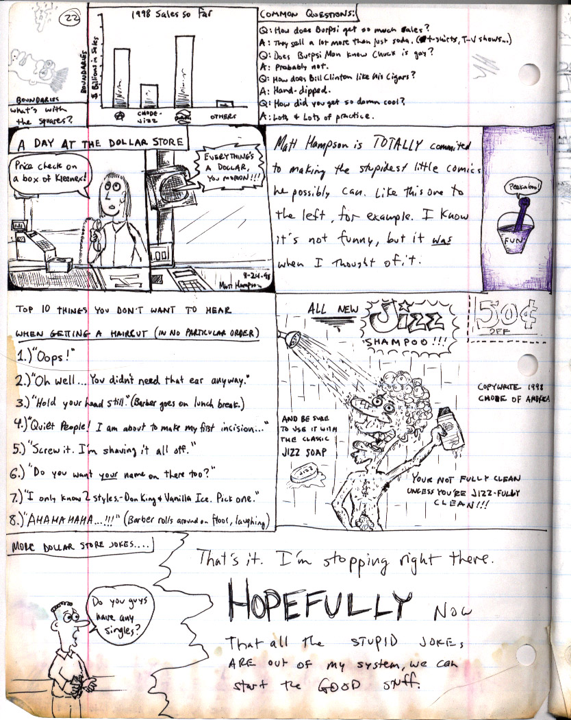 description: it's all boxy and stuff! this page is pretty much a collection of a bunch of dumb jokes, none of which are very good. you'll see the original location of the "Day at the Dollar Store" short comic, a bar graph showing that Chode Industries has gone way down after the match with Chuck the Fag, and an ad for Jizz Shampoo.