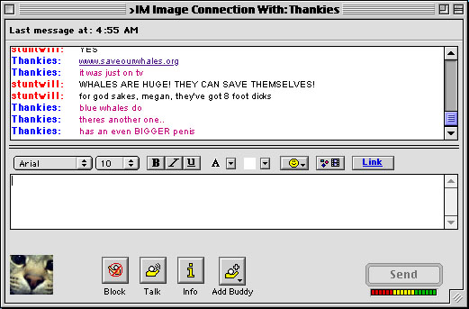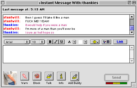 Bobo2269:YOUR A FUCKING PUSSY BITCH Bobo2269:DON'T FUCK WITH ME Bobo2269:I WILL BLOW UP YOUR HOUSE stuntwill:BAHAHAHA!!! stuntwill:I'LL JIZZ IN YOUR CREAMED CORN AND INSTALL CAMERAS IN YOUR HOUSE SO I CAN WATCH YOU EAT IT! stuntwill:THEN I"LL BROADCAST IT LIVE ON THE INTERNET FOR EVERYONE TO SEE! Bobo2269:I WILL BLOW IT UP WITH A BOMB, THEN I WILL FUCK YOUR MOM, SHE'S A GAY SLUT, ILL FUCK HER UP THE BUTT stuntwill:I'LL TIE FROZEN HOT DOGS TO THE SEATS OF EVERY ONE OF YOUR CHAIRS SO THAT THEY STICK YOU IN THE ASS WHENEVER YOU SIT DOWN! stuntwill:I'LL TIE A BOMB TO YOUR BLOW UP DOLL AND THEN I"LL ATTACH A BOMB TO THE BOMB SO THAT WHEN YOU TRY TO DISARM ONE OF THE BOMBS THE OTHER ONE GOES OFF! stuntwill:I'LL SHAVE A MONKEY AND REPLACE YOUR DAD AND WHEN YOU GO TO THE ZOO, YOUR DAD WILL BE IN THE CAGE AND WHEN YOU REALIZE IT'S YOUR DAD, THE SHAVED MONKEY WILL PUNCH YOU IN THE FACE! Bobo2269:YOUR A GAY FAG..I'LL PUT YOUR HEAD IN A BAG....UNTILL YOU CAN'T SEE...THEN ILL PEE ON YOUR FUCKIN FACE AND SPRAY YOU WITH MACE Bobo2269:your a fucking fag, NO ONE LIKES YOU, SO SHUT THE FUCK UP!! stuntwill:I'LL COVER YOUR HOUSE WITH SLICES OF BOLOGNA AND WHEN THEY ROT YOU'LL DIE OF ASPHYXIATION AND IT WILL SAY, "I STINK LIKE ROTTEN BOLOGNA" ON YOUR TOMBSTONE!